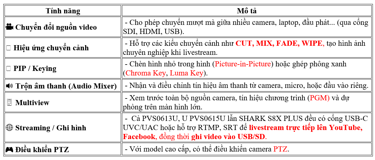 - SHARK S8X PLUS : Dòng cao cấp với 8–10 đầu vào video, màn hình 17.3”, hỗ trợ streaming, PTZ, keying nâng cao, dành cho truyền hình hoặc sự kiện lớn.