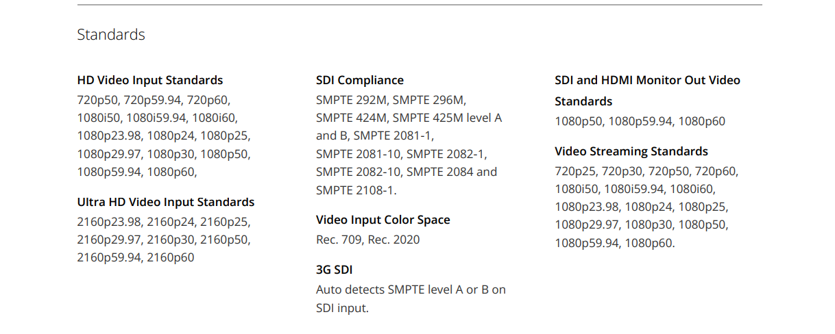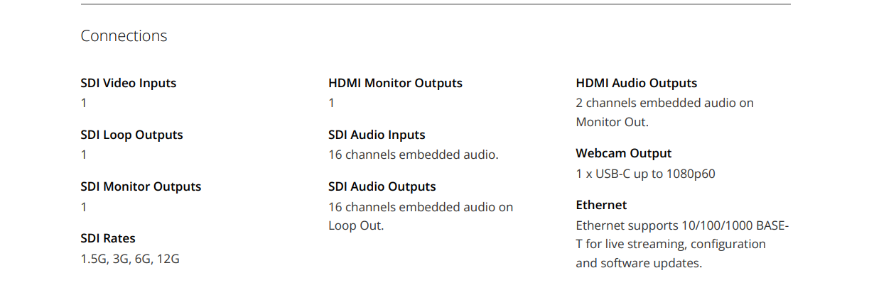 - Blackmagic Web Presenter bao gồm đầu vào SDI 12G với hỗ trợ cho tất cả các định dạng HD và Ultra HD lên đến 2160p60. Một vòng lặp đầu ra SDI 12G được bao gồm cho phép bạn lặp lại video qua nhiều người trình bày web, vì vậy bạn có thể phát trực tuyến đến nhiều dịch vụ. Blackmagic Web Presenter có công nghệ chuyển đổi Teranex trên đầu vào SDI cho video cực kỳ rõ ràng. Blackmagic Web Presenter lấy tín hiệu đầu vào HD hoặc Ultra HD và tự động chuyển đổi thành tín hiệu chất lượng cao 1080p HD, tốc độ dữ liệu chậm, tín hiệu này được gửi đến phần cứng H.264 mã hóa để phát trực tuyến và tới máy tính khi sử dụng USB webcam đầu ra. Tất cả điều này có nghĩa là bạn có thể sử dụng bất kỳ nguồn HD hoặc Ultra HD nào để phát trực tuyến!