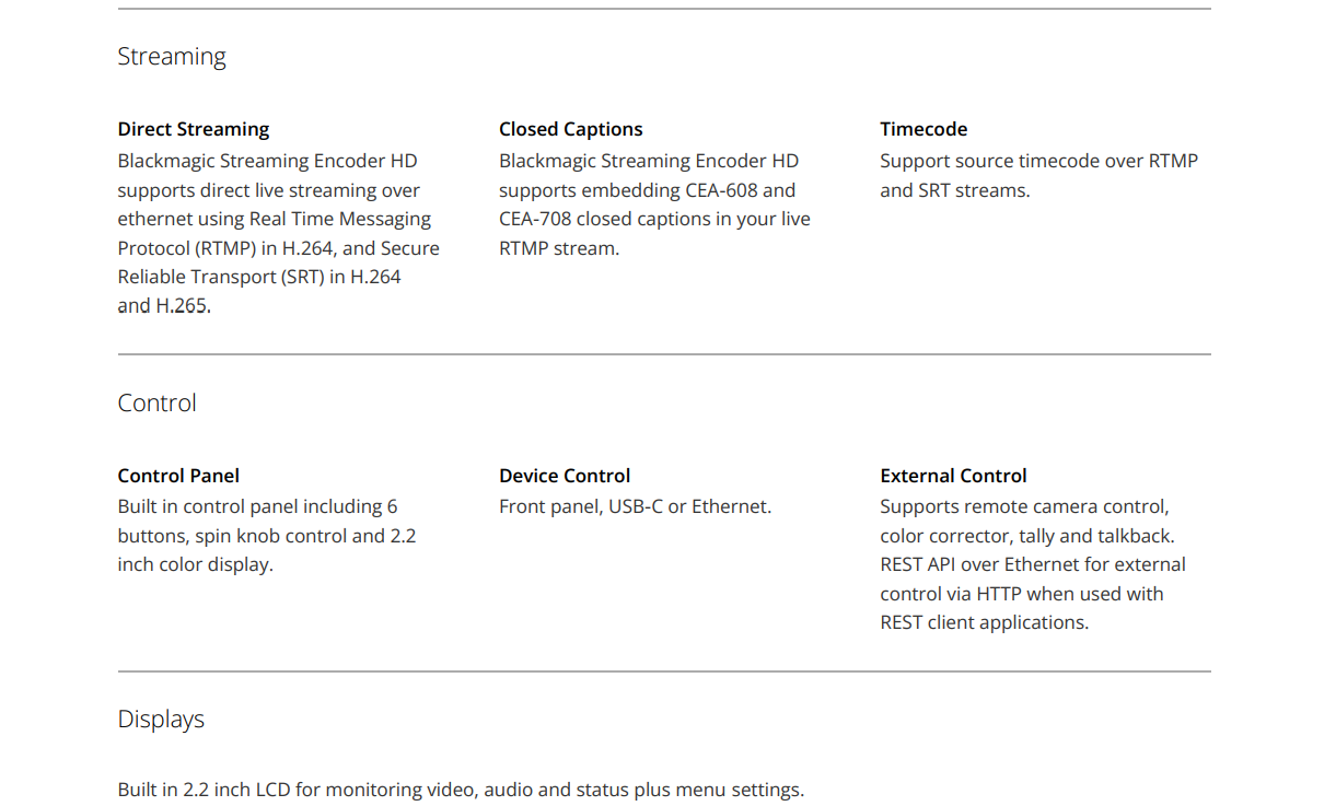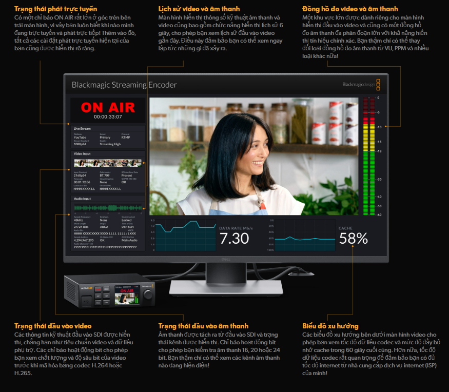 - Giải pháp phát trực tuyến độc lập với bộ phát sóng mã hóa H.264, truyền trực tiếp đến các dịch vụ như YouTube, webcam USB, đầu vào 12G ‑ SDI với chuyển đổi tiêu chuẩn