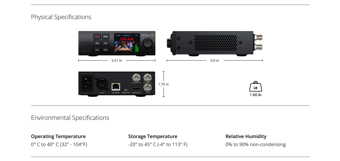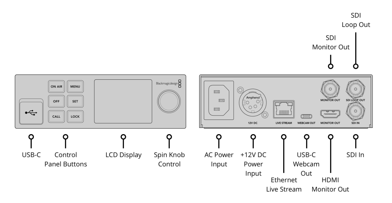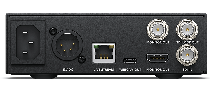 - Blackmagic Web Presenter dựa trên thiết kế mô-đun Teranex Mini cho phép sử dụng máy tính để bàn hoặc hỗ trợ giá cả. Nó bao gồm một nguồn điện AC tích hợp, cộng với một đầu nối DC 4 chân 12V cho nguồn dự phòng hoặc hoạt động của pin. Thiết kế cực kỳ di động chỉ rộng 5,5 inch, có nghĩa là bạn có thể gắn 3 trong một đơn vị giá hỗ trợ duy nhất, hoàn hảo khi bạn cần phát trực tuyến đến nhiều dịch vụ độc lập cùng một lúc. Ngoài ra, bạn có thể kết hợp Blackmagic Web Presenter với các sản phẩm khác như bộ chuyển đổi HD ATEM Television Studio để có giải pháp sản xuất trực tiếp và phát trực tuyến trong một đơn vị giá duy nhất. Mặt trước bao gồm kết nối USB, vì vậy bạn có thể cắm vào máy tính để thay đổi cài đặt cục bộ nhanh chóng.