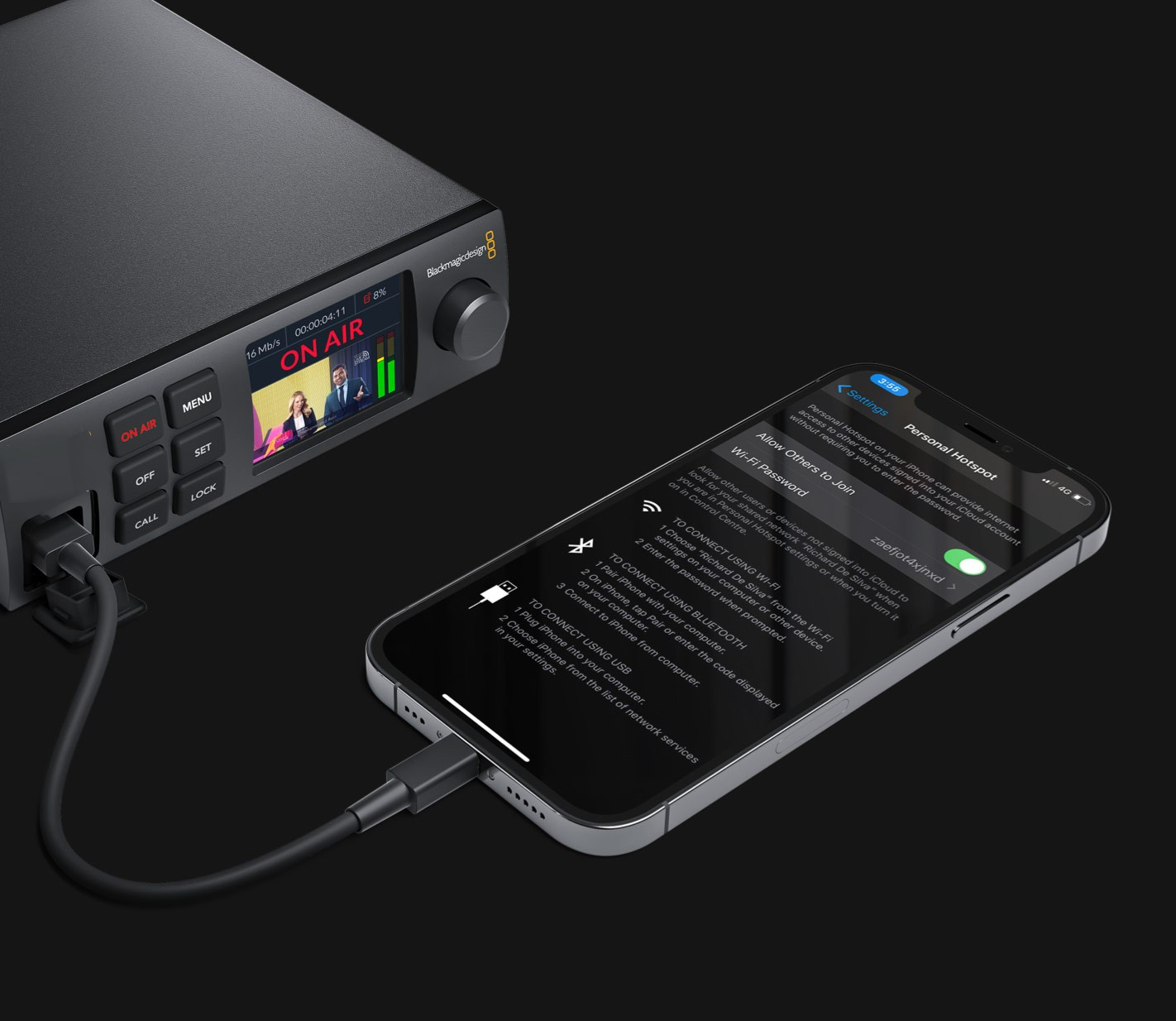 Nếu bạn đang phát trực tuyến từ một vị trí từ xa hoặc bạn cần bản sao lưu cho kết nối chính Ethernet, bạn có thể cắm điện thoại Apple hoặc Android để kết nối với internet qua dữ liệu di động. Để thuận tiện, các kết nối USB ở cả mặt trước và mặt sau đều có thể được sử dụng để chia sẻ kết nối điện thoại. Thêm vào đó, nó hoạt động với điện thoại 5G tốc độ cao nhất, cũng như điện thoại 4G! Blackmagic Web Presenter sẽ tự động phát hiện khi điện thoại được kết nối và chuyển kết nối internet của nó để sử dụng nó. Bạn có thể chọn Ethernet hoặc điện thoại ưu tiên, điều này giúp sao lưu điện thoại di động hoàn toàn tự động. Ngoài ra, bằng cách sử dụng chia sẻ kết nối điện thoại và dữ liệu di động, Web Presenter trở thành giải pháp phát trực tuyến vị trí từ xa hoàn hảo!