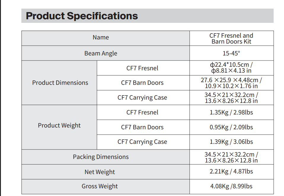 Bộ thấu kính Fresnel CF7 kèm cửa chắn sáng là một thấu kính Fresnel 7 inch gắn trên ngàm Bowens, đi kèm với 8 cửa chắn sáng. Nó cung cấp phạm vi chùm sáng từ 15º đến 40º trong khi vẫn giữ được kích thước nhỏ gọn. Hệ thống lấy nét mở rộng kép với nhiều thấu kính giúp giảm đáng kể kích thước và trọng lượng mà không ảnh hưởng đến hiệu suất quang học. Thiết kế nhỏ gọn được tối ưu hóa để sử dụng với STORM 400x.