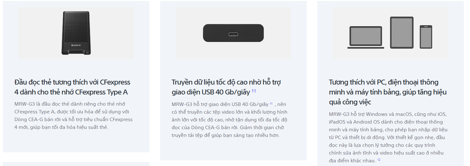 - MRW-G3 hỗ trợ USB 40Gbps, cho phép truyền tải tốc độ cao các tệp video dung lượng lớn và số lượng hình ảnh lớn bằng cách tận dụng tối đa tốc độ đọc của dòng CEA-G tùy chọn. Giảm thời gian chờ đợi truyền tải tệp và dành nhiều thời gian hơn cho việc sáng tạo.