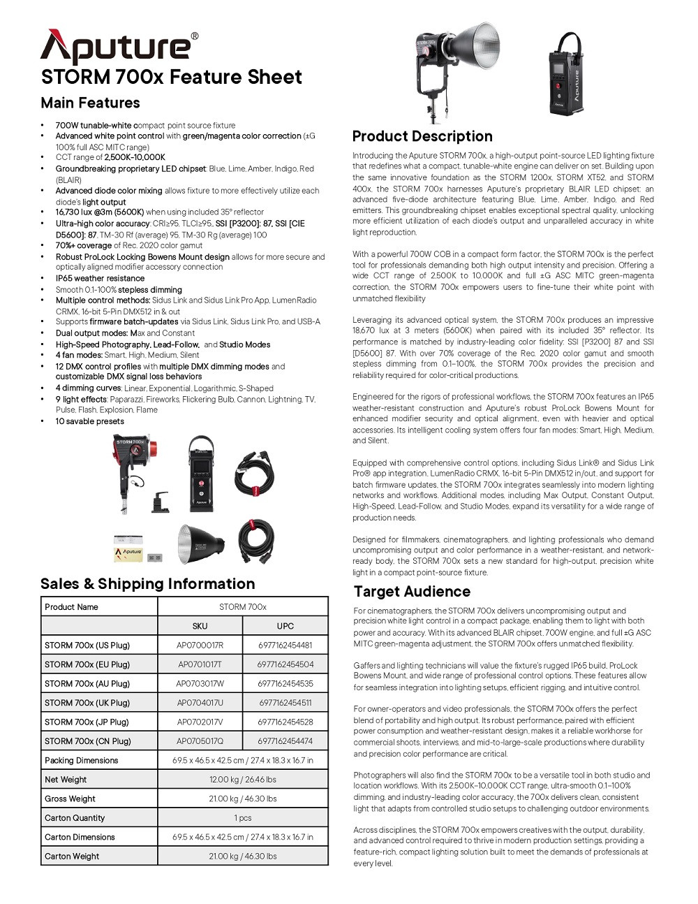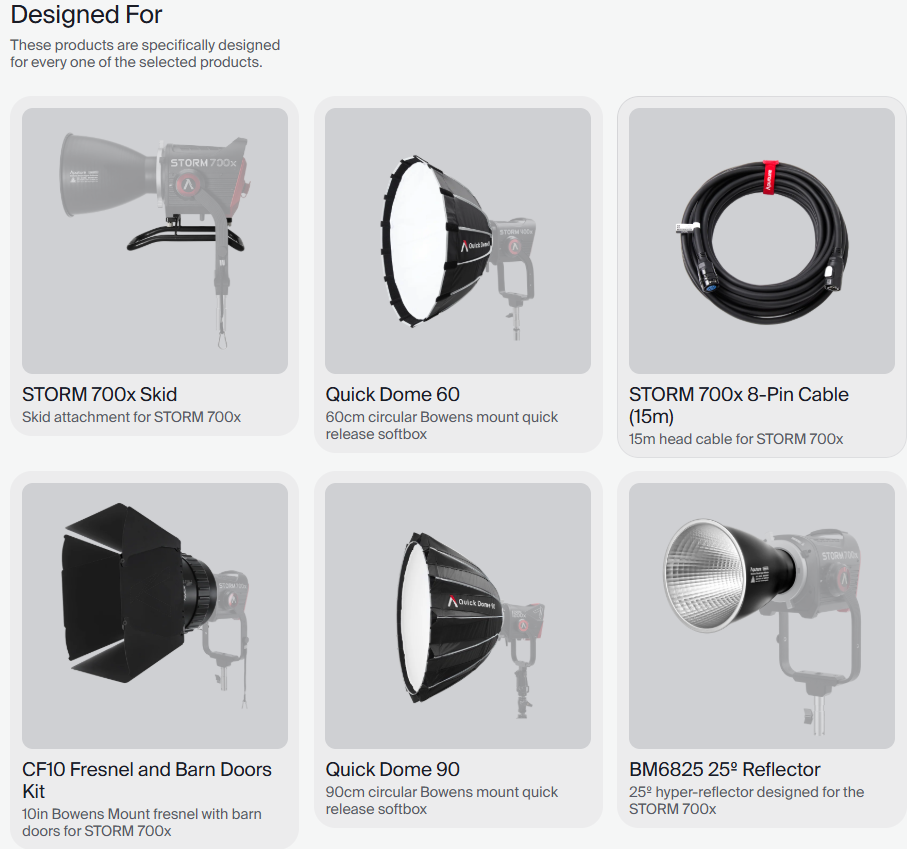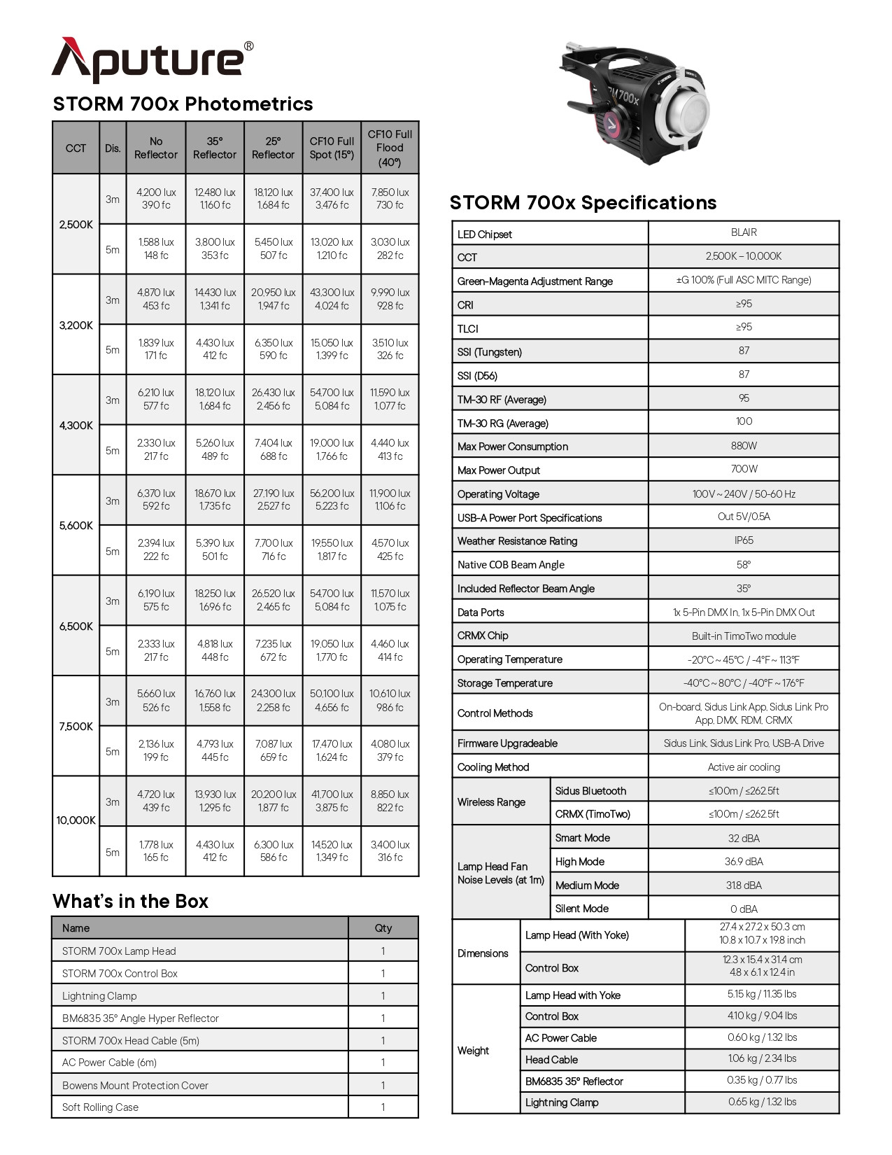 - Đèn LED điểm STORM 700x sáng hơn bất kỳ đèn LED điểm nào khác trong cùng dải công suất, chỉ nặng 5,15kg và có thể gắn trên cả chân đế nhỏ hoặc lớn. Kết hợp với thấu kính Fresnel CF10 cho công suất chiếu sáng trên 19.000 lux ở khoảng cách 3m.