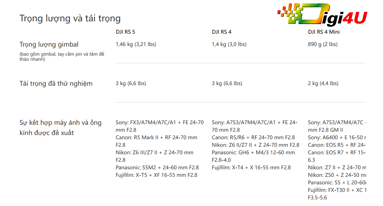 - Gimbal chỉ nặng 1,46 kg với báng cầm pin và tấm tháo nhanh, và có thể chuyển sang chế độ chụp dọc mà không cần phụ kiện bổ sung. Với khả năng chịu tải mạnh mẽ 3kg (6,6lbs), nó có thể dễ dàng mang theo các tổ hợp máy ảnh và ống kính không gương lật thông dụng
