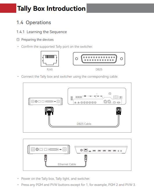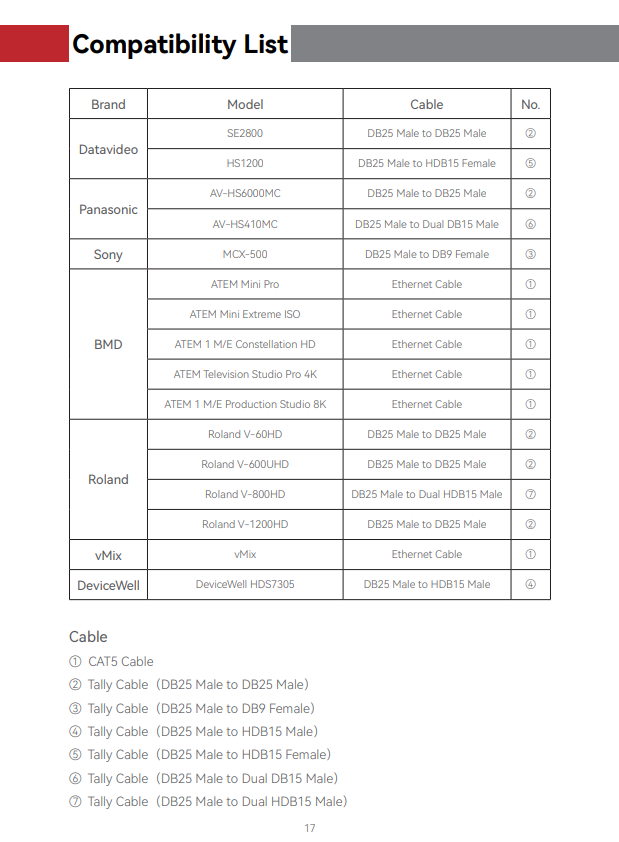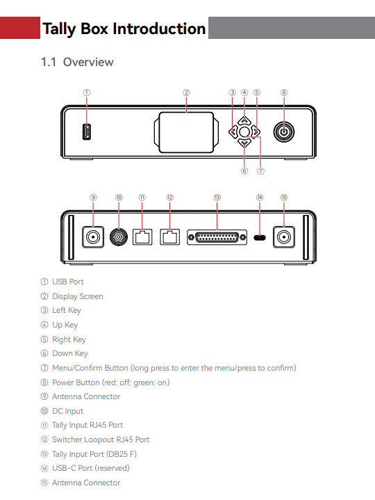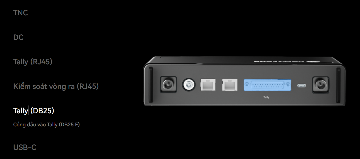 - Hệ thống Tally không dây cung cấp nhiều tùy chọn cổng, bao gồm DB25, RJ45 và USB-C, để hỗ trợ kết nối với nhiều bộ chuyển mạch khác nhau.