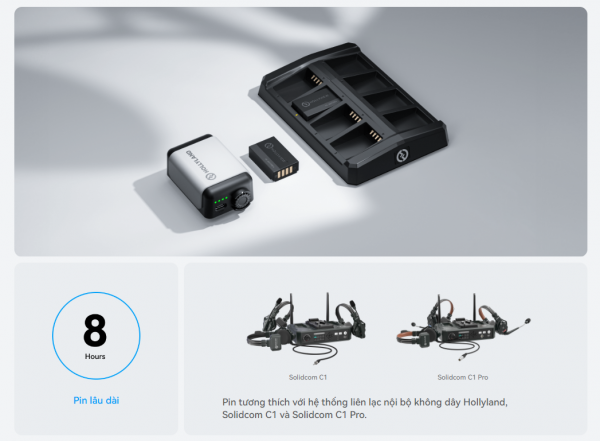 • Pin tương thích với hệ thống liên lạc nội bộ không dây Hollyland, Solidcom C1 và Solidcom C1 Pro.
