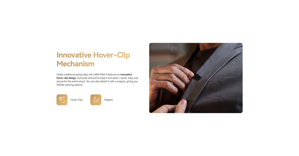 - Không còn những chiếc kẹp nặng nề, thô kệch. Hover-Clip siêu nhẹ chỉ 14g giúp micro gắn chắc vào áo mà vẫn tinh tế, kín đáo. Kết hợp nam châm từ tính thông minh, bạn có thể linh hoạt cố định micro vào nhiều bề mặt khác nhau, phù hợp với cả trang phục biểu diễn, áo vest hay váy nữ.