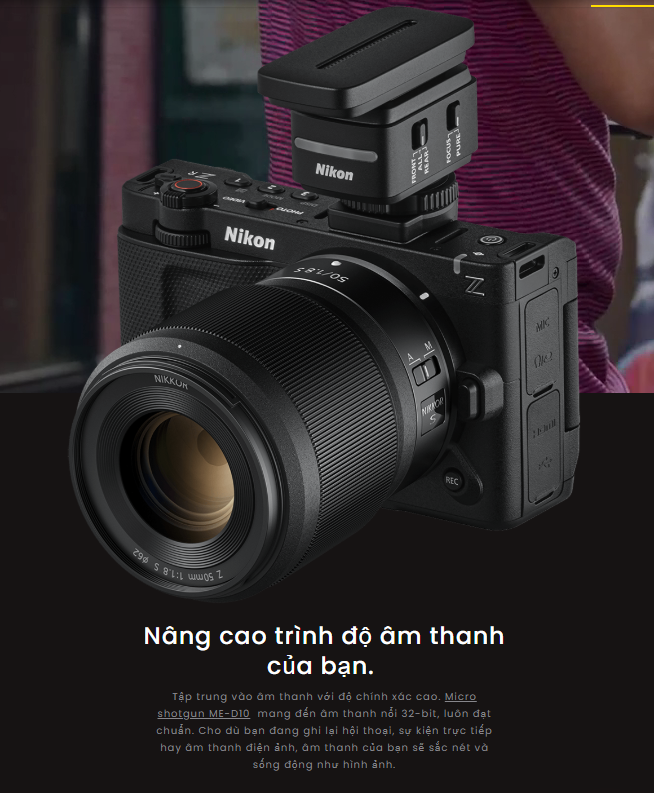 - Nikon ZR là máy quay đầu tiên tích hợp khả năng ghi âm thanh nổi 32-bit trực tiếp vào thân máy, duy trì toàn bộ khoảng không ngay cả khi mức âm lượng tăng đột biến. Tính năng nổi bật này đảm bảo âm thanh hội thoại, nhạc và môi trường có thể được thu lại rõ nét trong quá trình hậu kỳ mà không bị cắt đoạn. Micrô kỹ thuật số của Nikon mở rộng các tùy chọn này hơn nữa với ba mẫu thu âm và chế độ PURE và FOCUS chuyên dụng, tất cả đều hoạt động không cần dây cáp. Bằng cách kết hợp khả năng xử lý mạnh mẽ trong máy với khả năng điều khiển micrô linh hoạt, ZR mang đến âm thanh đáng tin cậy tại hiện trường, giảm thiểu sự phụ thuộc vào máy ghi âm bên ngoài mà vẫn duy trì chất lượng chuyên nghiệp.