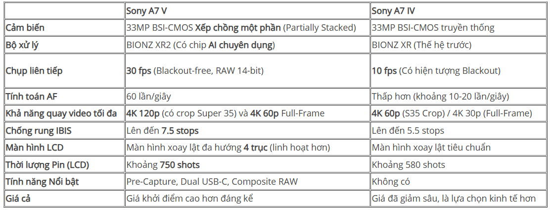 - Sony A7 V là một chiếc máy ảnh được tái phát triển toàn diện, thu hẹp khoảng cách giữa dòng A7 phổ thông và các dòng flagship chuyên biệt (A7S cho video, A7R cho độ phân giải, A9/A1 cho tốc độ).