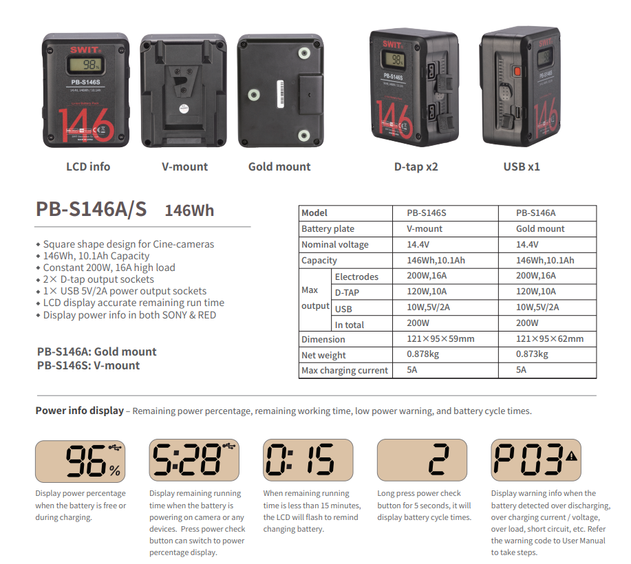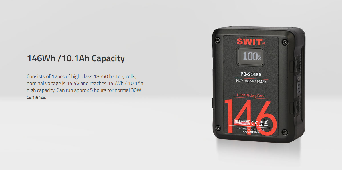 - Pin SWIT PB-S146A sử dụng 12 cell pin 18650 cao cấp, điện áp danh định 14.4V, dung lượng lên tới 146Wh / 10.1Ah. Với dung lượng này, pin có thể hoạt động khoảng 5 giờ với các máy quay tiêu thụ 30W, mang lại khả năng quay lâu dài mà không lo hết năng lượng giữa chừng.