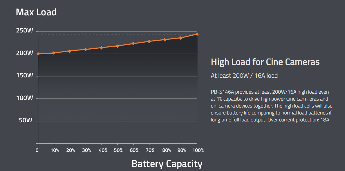 - Pin SWIT PB-S146A cung cấp công suất tải cao lên đến 200W / 16A, ngay cả khi dung lượng pin chỉ còn 1%, giúp vận hành ổn định cho máy quay phim chuyên nghiệp và các thiết bị đi kèm. Với cell tải cao, pin không chỉ đảm bảo hiệu suất mạnh mẽ mà còn kéo dài tuổi thọ so với các dòng pin tải thông thường khi sử dụng ở mức công suất tối đa trong thời gian dài.