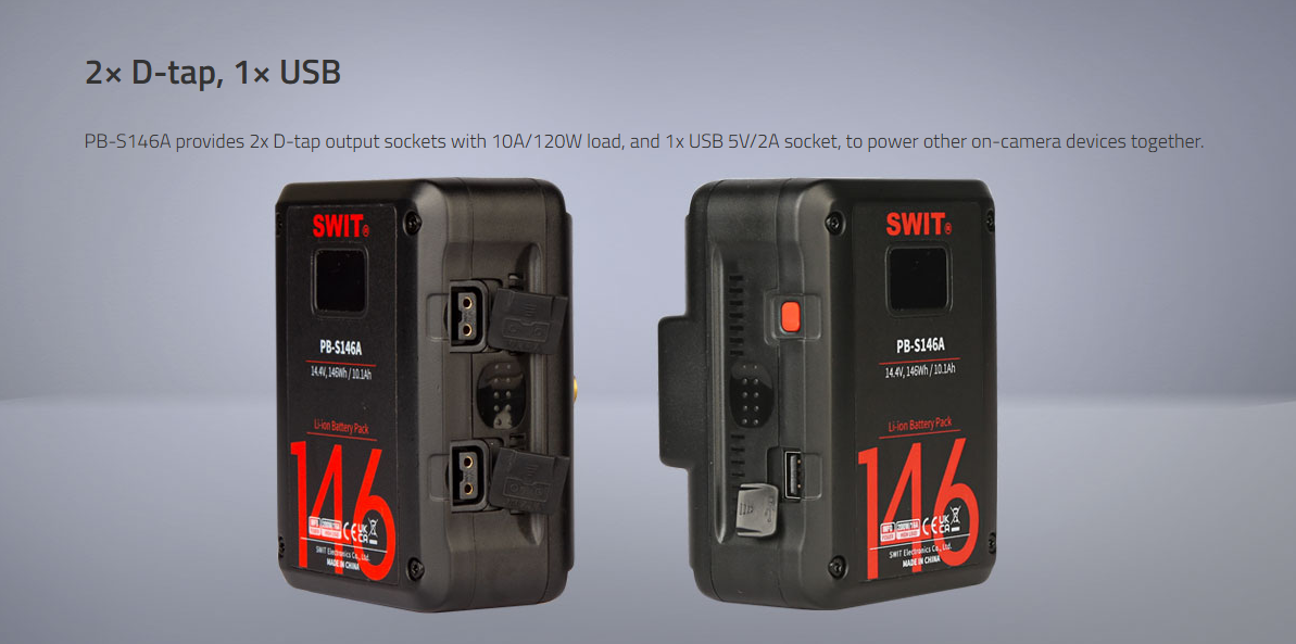 - Pin SWIT PB-S146A được trang bị 2 cổng D-Tap với công suất 10A/120W, cùng 1 cổng USB 5V/2A, giúp cấp nguồn cho nhiều thiết bị gắn trên máy quay một cách dễ dàng và tiện lợi. Điều này mang đến sự linh hoạt và tiện ích tối đa cho người dùng trong quá trình sử dụng thiết bị quay phim.