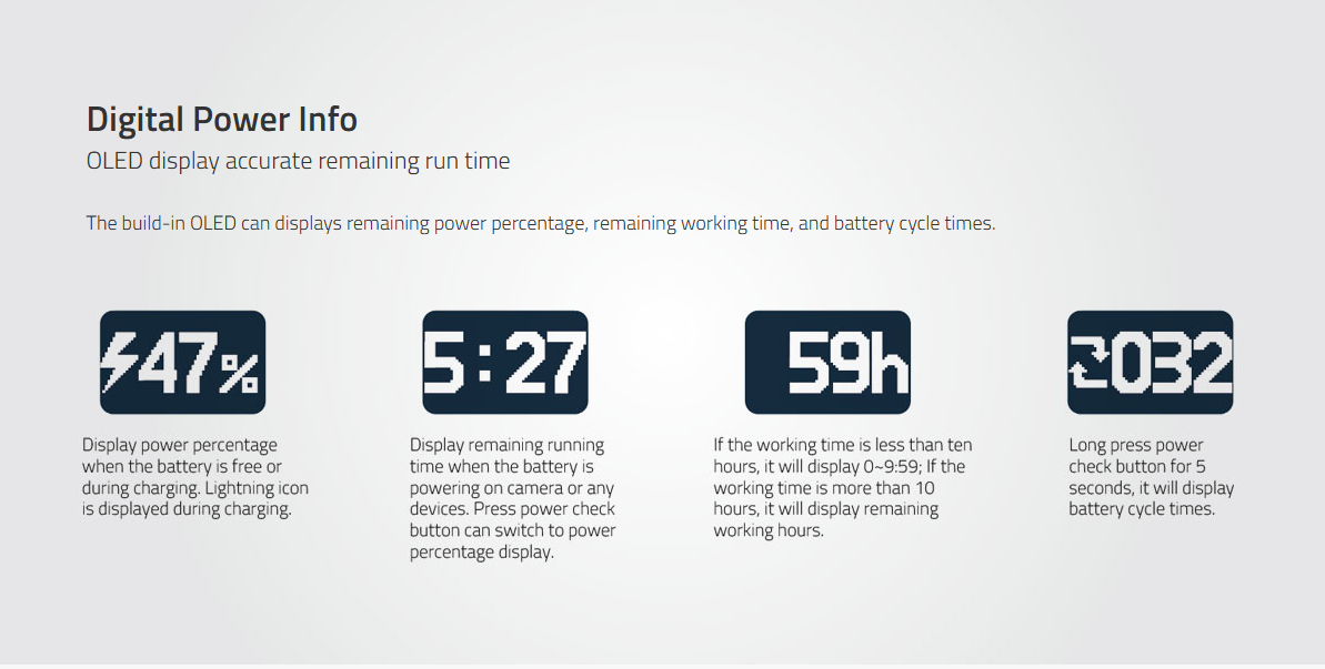 Pin SWIT PB-S146A tích hợp màn hình OLED, hiển thị chính xác phần trăm pin còn lại, thời gian hoạt động ước tính, và số chu kỳ sạc, giúp người dùng kiểm soát nguồn điện hiệu quả hơn.