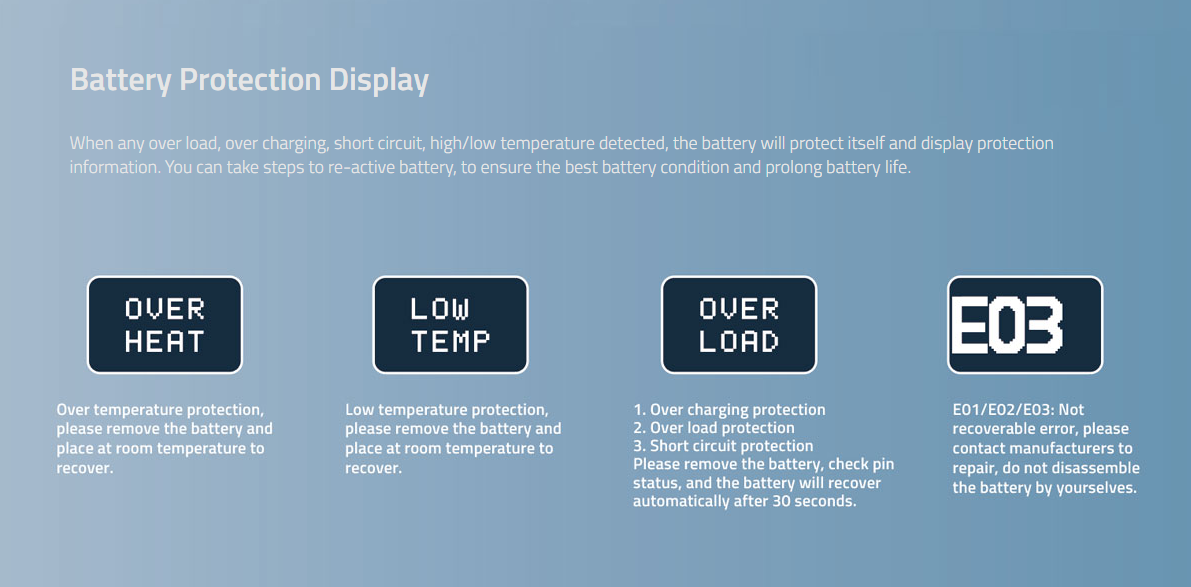 - Khi phát hiện quá tải, sạc quá mức, đoản mạch hoặc nhiệt độ quá cao/thấp, pin sẽ tự động kích hoạt chế độ bảo vệ và hiển thị thông tin cảnh báo. Người dùng có thể thực hiện các bước khắc phục để kích hoạt lại pin, đảm bảo hiệu suất tối ưu và kéo dài tuổi thọ pin.
