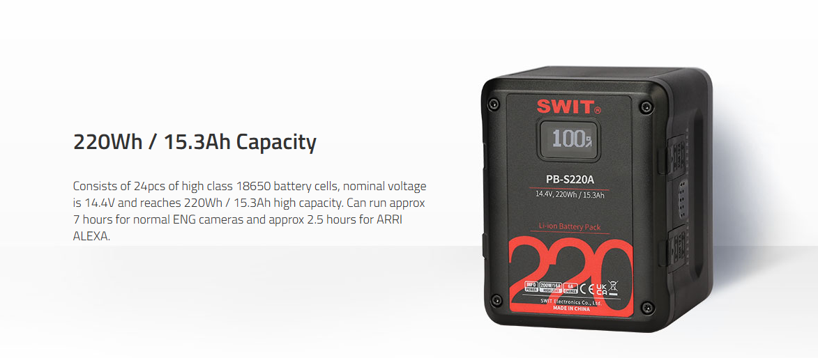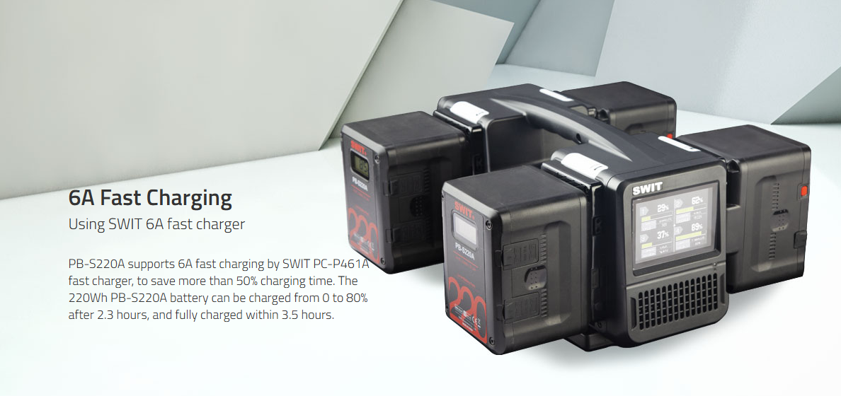 - Pin V-Mount SWIT PB-S220A hỗ trợ sạc nhanh 6A bằng bộ sạc nhanh SWIT PC-P461S hoặc S-3812S, giúp tiết kiệm hơn 50% thời gian sạc. Pin 220Wh PB-S220A có thể sạc từ 0 đến 80% sau 2,3 giờ và sạc đầy trong vòng 3,5 giờ.