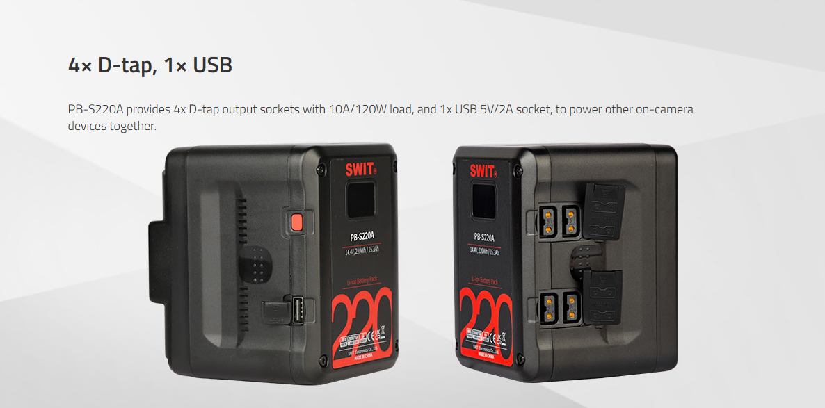 - Pin V-Mount SWIT PB-S220A cung cấp 4 ổ cắm đầu ra D-tap với tải 10A/120W và 1 ổ cắm USB 5V/2A để cấp nguồn cho các thiết bị trên máy ảnh khác cùng nhau… Sạc nhanh 6A.
