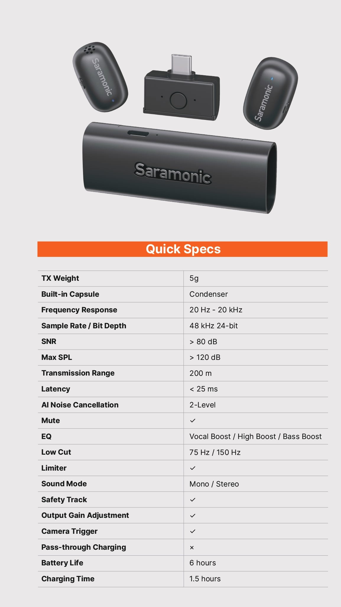 Công nghệ khử ồn AI thực thụ đầu tiên của Saramonic, lọc đến 40 dB tiếng ồn nền cho giọng nói rõ ràng