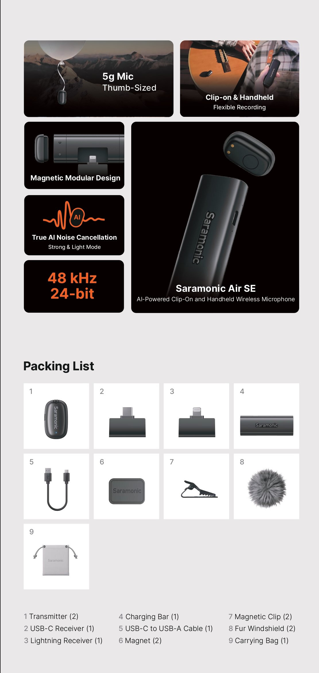Mic không dây SARAMONIC AIR SE-(1RX x 2TX) kêt nối Lightning & Type-C | Chính hãng