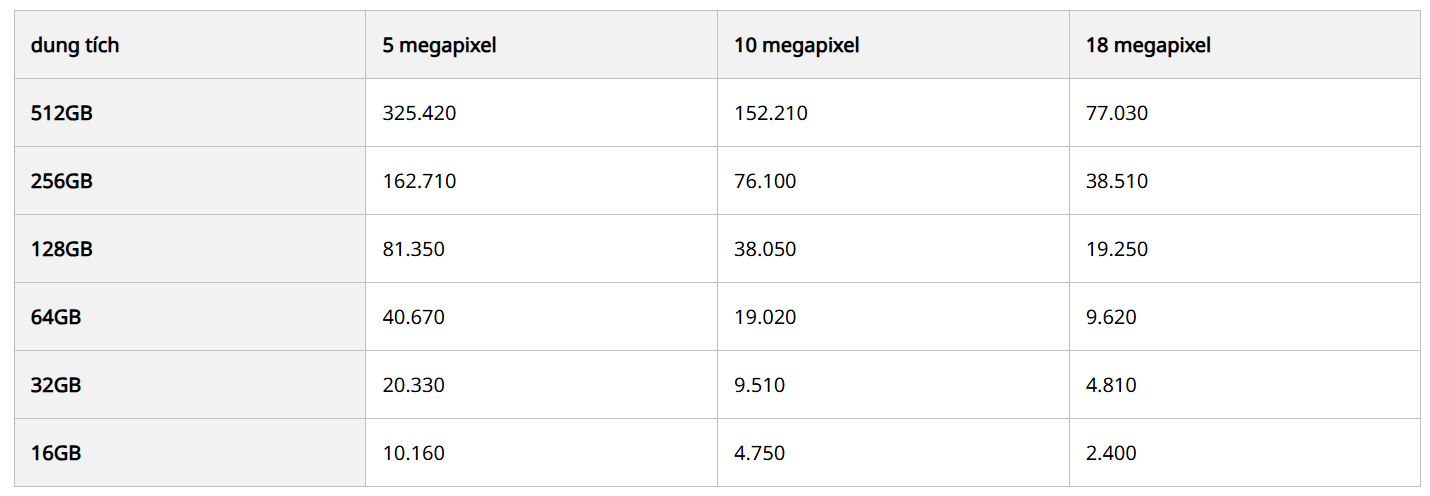 Ảnh (số lượng ảnh)* Thời gian ghi hình: Thời gian ghi hình thực tế sẽ khác nhau tùy thuộc vào thiết bị, độ phân giải và tỷ lệ nén của bạn. Các tính toán dựa trên tỷ lệ 1 Mbps = 1.000.000 bps.